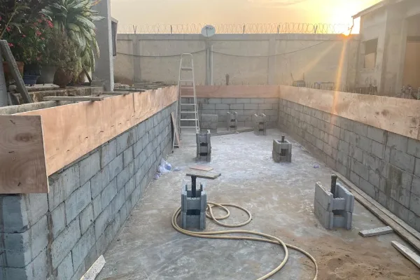 Piscine en construction avec radier béton et parois en blocs à bancher, mise en place des canalisations et pièces à sceller.