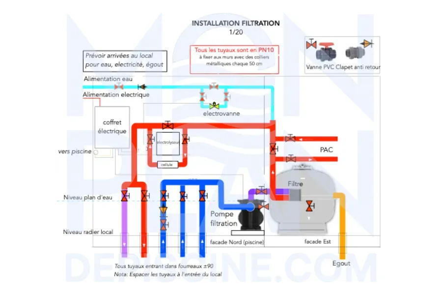 Le plan d’installation de la filtration, proposé séparément, vient compléter ce document en détaillant l’organisation du local technique et l’équilibrage des débits.